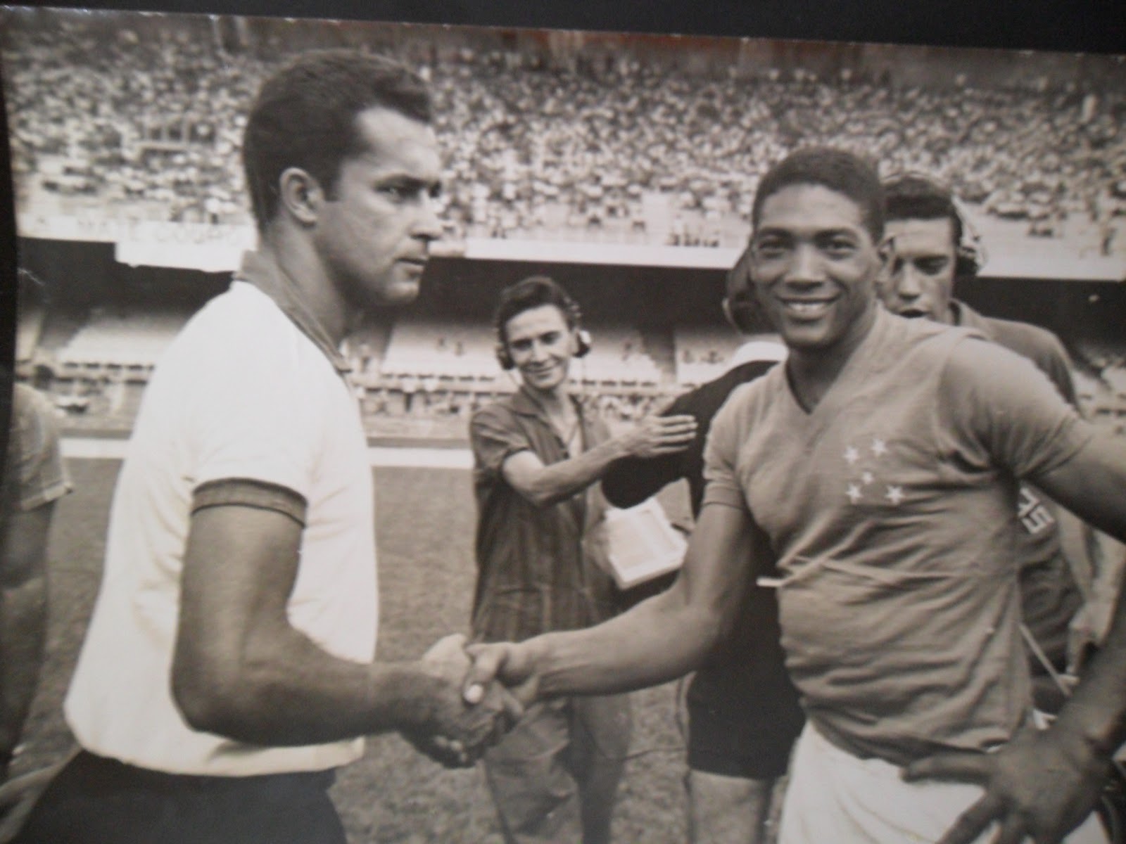 | Caillaux cumprimenta Vavá do Cruzeiro antes de uma partida em 1961. |